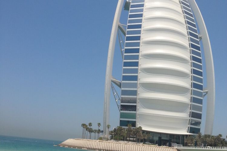 【七星帆船酒店】(外观)(约20分钟)阿拉伯塔酒店(Burj Al Arab),因外形酷似船帆,又称迪拜帆船酒店,位于阿联酋迪拜海湾,以金碧辉煌、奢华无比著称。酒店建在离沙滩岸边280米远的波斯湾内的人工岛上,仅由一条弯曲的道路连接陆地,酒店共有56层,321米高。凭借独特的外观造型及金碧辉煌、奢华无比的装饰、全智能化的管家式服务,享誉全世界。