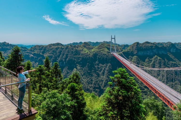 早餐后游览【张家界大峡谷玻璃桥】。张家界大峡谷集山、水、洞、湖于一身,被誉为“张家界地貌的博物馆”!峡谷内栈道绵延数里,沿途飞瀑神泉比比皆是,宛如世外桃源。漫步【世界最高、跨度最长的玻璃桥——云天渡玻璃桥】,张家界大峡谷玻璃桥为世界首座斜拉式高山峡谷玻璃桥,并创下世界最高最长玻璃桥、首次使用新型复合材料建造桥梁等多项世界之最,桥面长375米,宽6米,走在300米高空的玻璃桥上,仰望蓝天白云,俯瞰溪流潺潺,感受云端刺激,挑战自我!