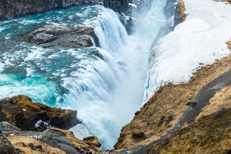 游览黛提瀑布(Dettifoss)。黛提瀑布位于冰岛北部国家公园米湖区附近,其源流是瓦特纳冰原。黛提瀑布宽度约100米,高度有44米,被认为是欧洲落差最大、流量最大的瀑布。流量因季节而异,枯水期约有每秒200立方米;夏季冰融使河水增加,流量也达到500立方米。由于黛提瀑布水量很大,只要听水声就可以找到瀑布所在地。当河流经过荒凉地区,强大的水流带着泥砂流过44米的断崖,其气势无比的惊人。冰岛著名作曲家琼·莱夫斯从此瀑布得到灵感,谱写了一首曲子“Dettifoss”。这里也是电影《普罗米修斯》的拍摄地之一(参观时间约1小时)。