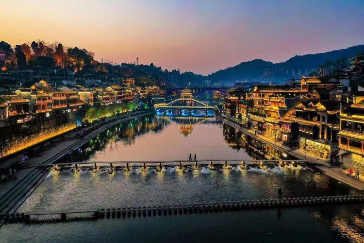 【凤凰夜景】漫步在沱江两岸、北门码头、跳岩和虹桥等景区点,看美景、赏夜色、品民俗,尽情享受浪漫十足的“夜凤凰”。入夜的凤凰,在或强或弱、或冷或暖的色调里,美仑美奂的“夜凤凰”融入了凤凰古城“山、水、城、人、文”的抒情小诗,让梦回故乡的意境与韵律随着河水静静流淌。