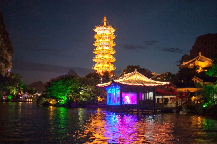 登上桂林标志性建筑,桂林的新地标——【日月双塔】(约60分钟),铜塔所有构件如塔什、瓦面、翘角、斗拱、雀替、门窗、柱梁、天面、地面完全由铜壁画装饰,整座铜塔创下了三项世界之最——世界上最高的铜塔,世界上最高的铜质建筑物,世界上最高的水中塔。